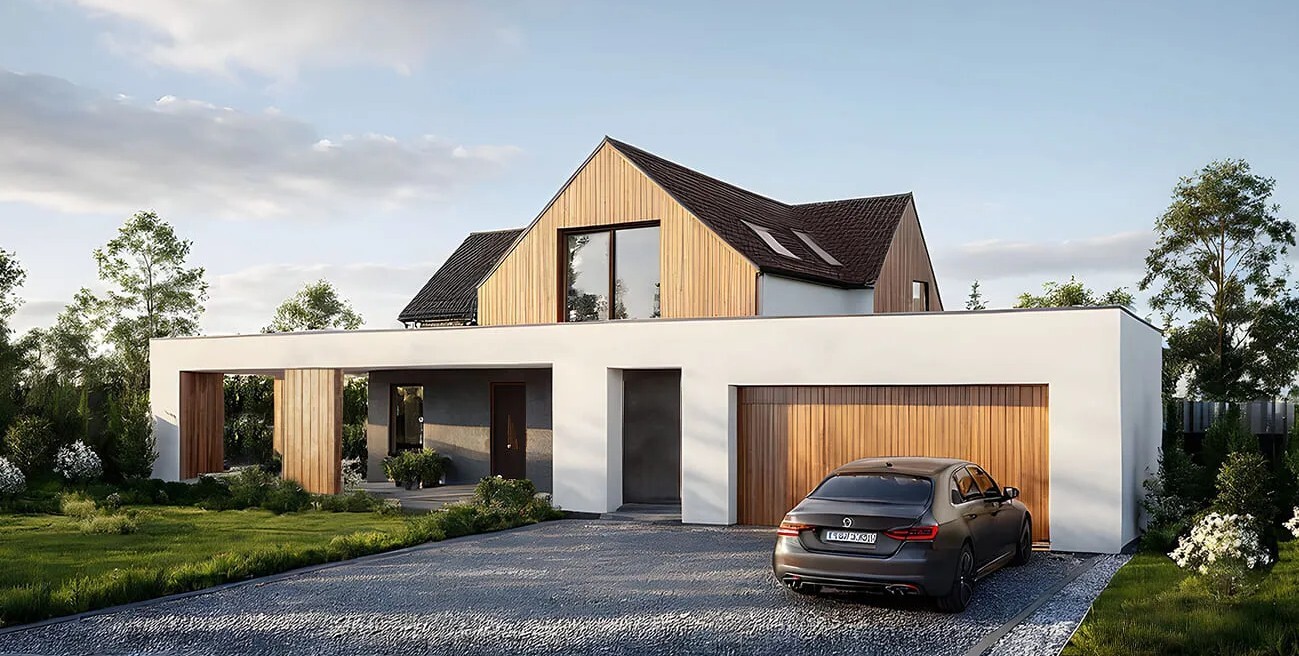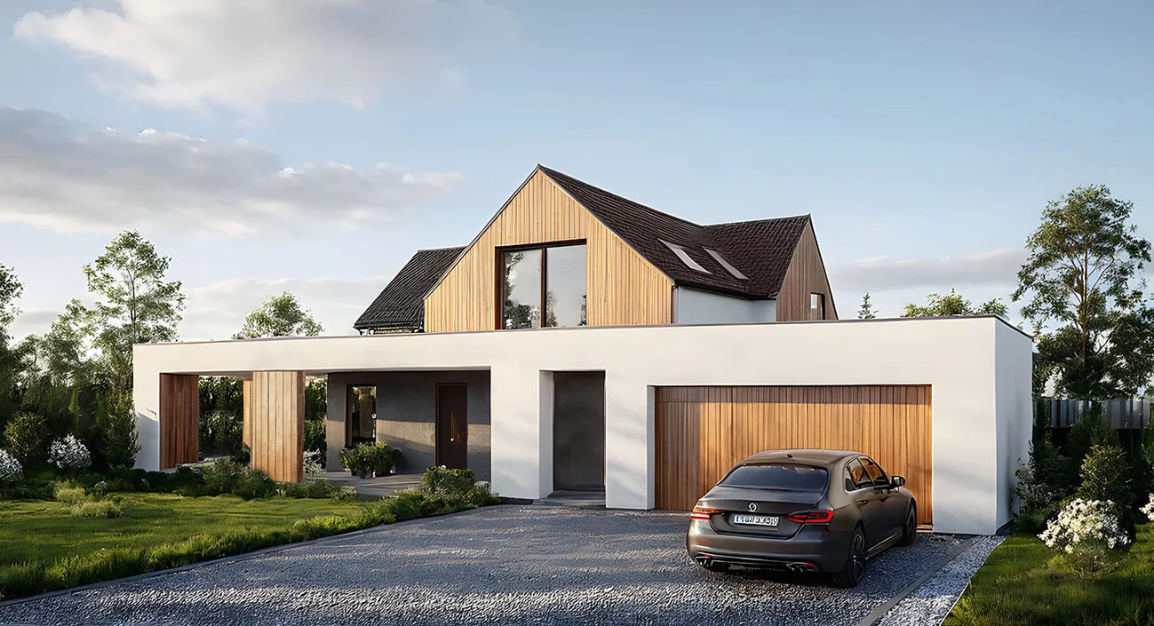 Funkcjonalność idzie w parze z estetyką. W parterowej części bryły zaprojektowano dwustanowiskowy garaż, który został dyskretnie wkomponowany w całość. Ten projekt domu pod Poznaniem to idealna propozycja dla osób ceniących nowoczesny design, bliskość natury i ponadczasowe rozwiązania architektoniczne.