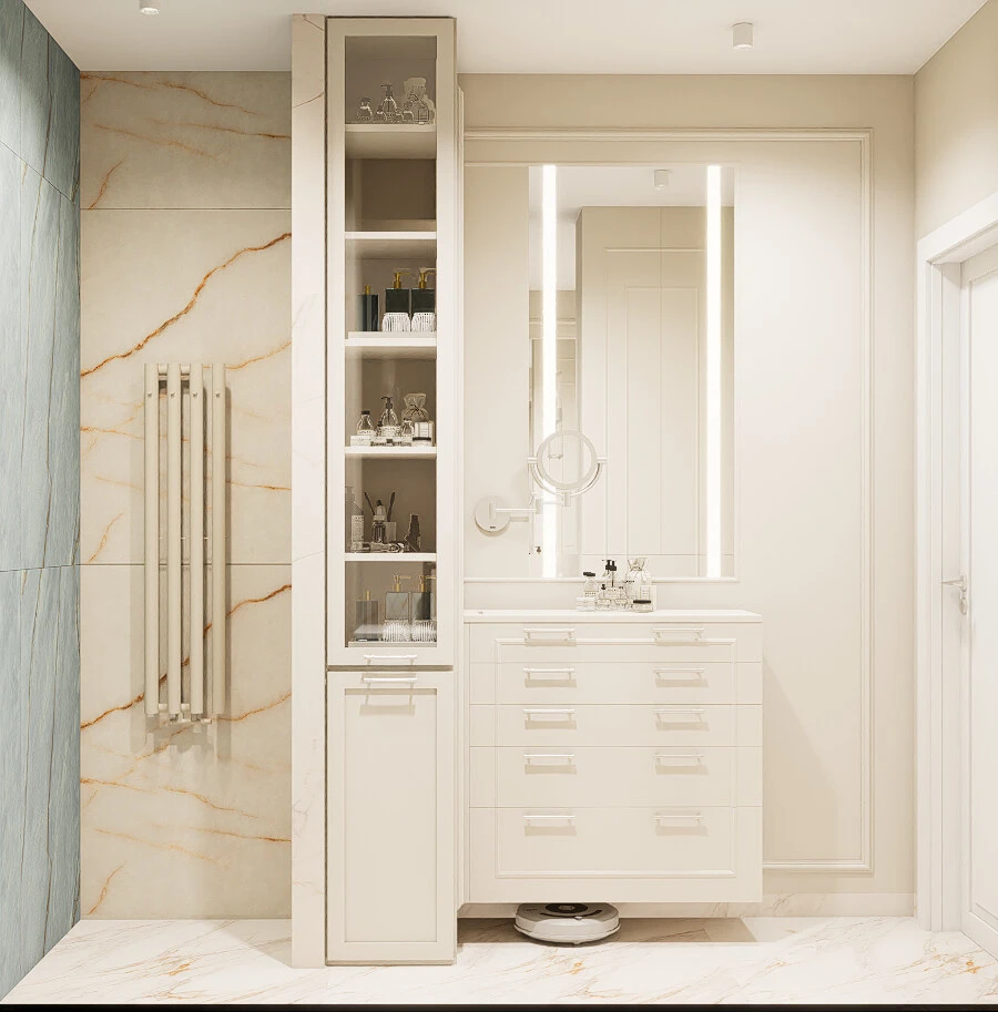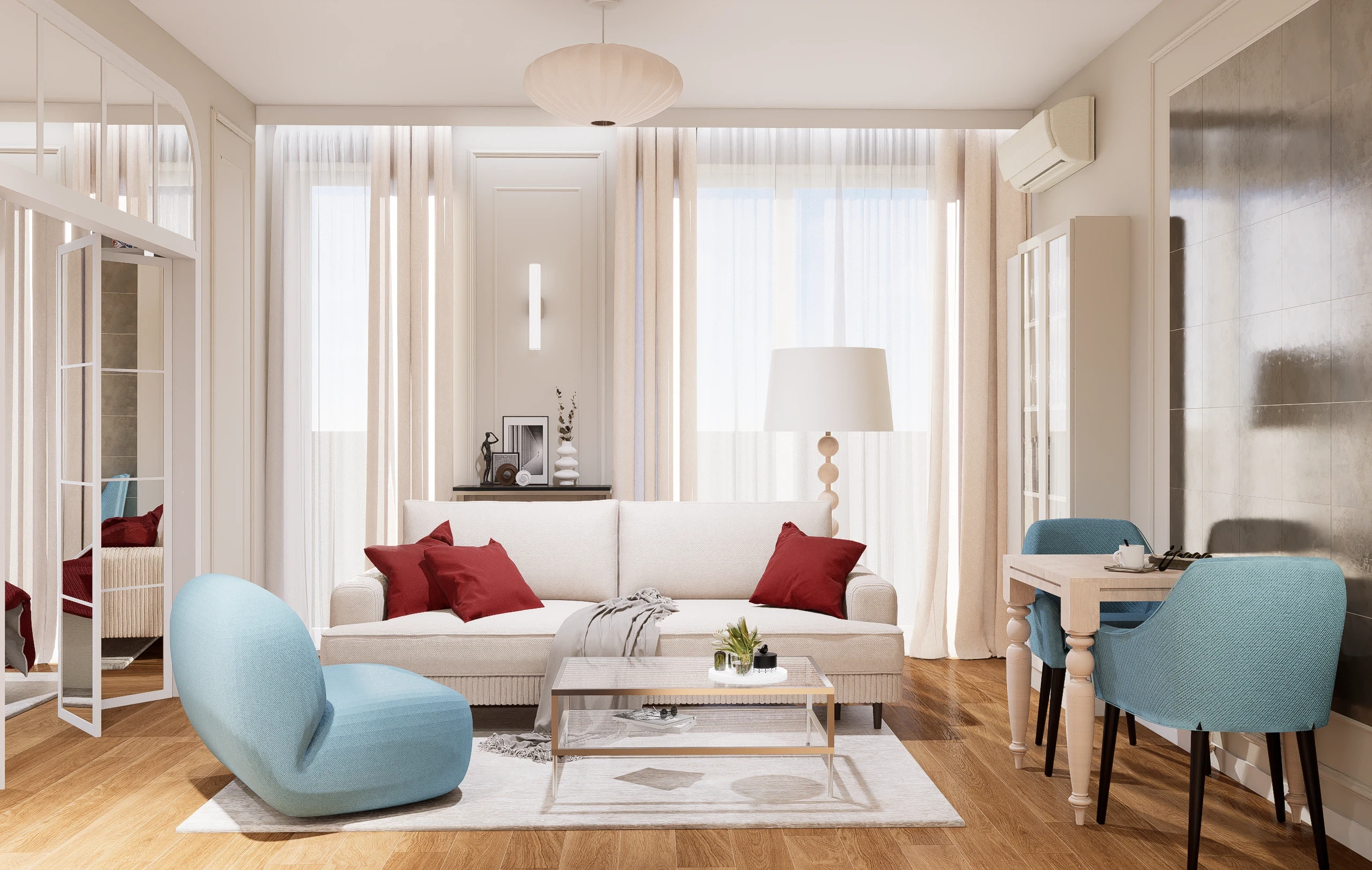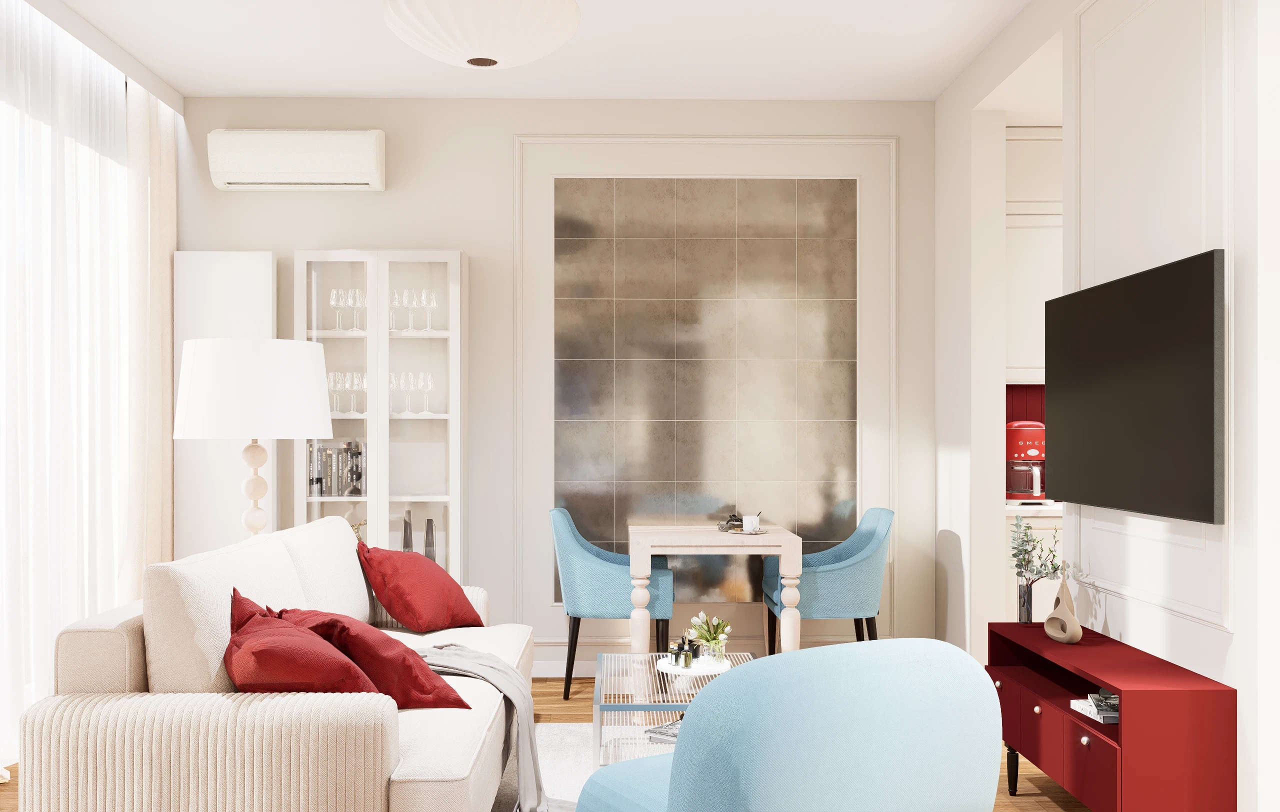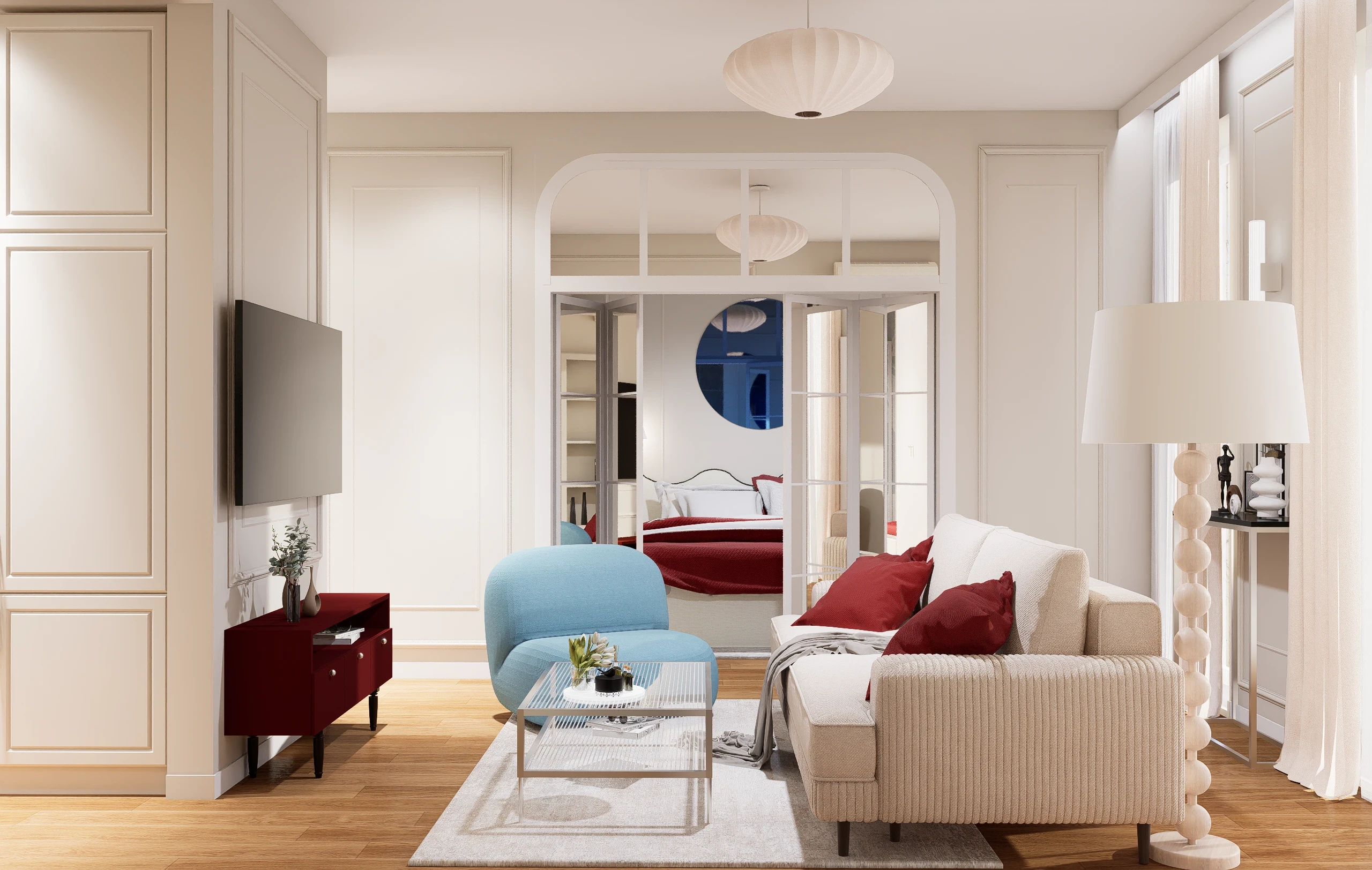 Bazą aranżacji są jasne, ciepłe odcienie bieli i beżu, klasyczne frezowane zabudowy oraz naturalne materiały, które nadają wnętrzu ponadczasowy charakter. Na tym spokojnym tle pojawia się niecodzienna, starannie dobrana kolorystyka – chłodne błękity w meblach tapicerowanych oraz głębokie akcenty czerwieni, które wprowadzają energię i wyrazistość. Całość uzupełniają kamienne powierzchnie o delikatnym rysunku oraz przemyślane oświetlenie, podkreślające faktury i proporcje wnętrza.