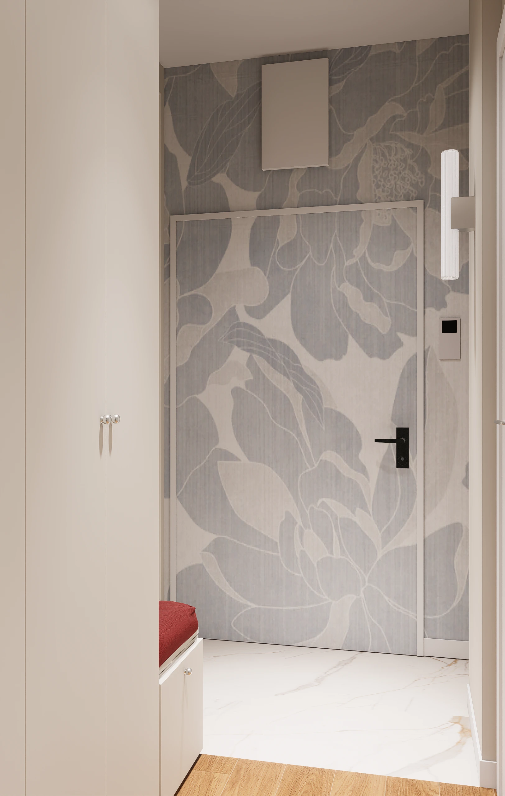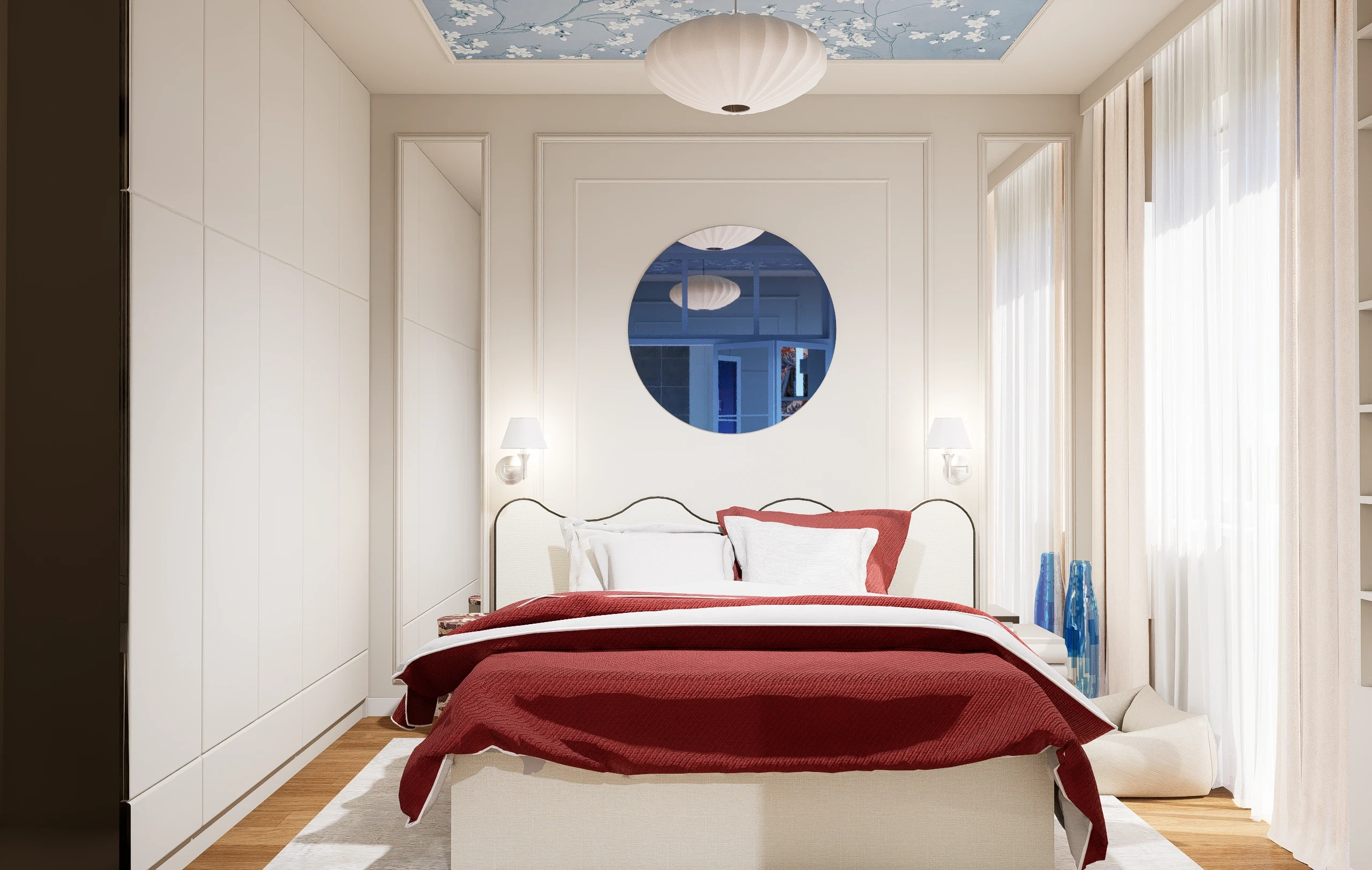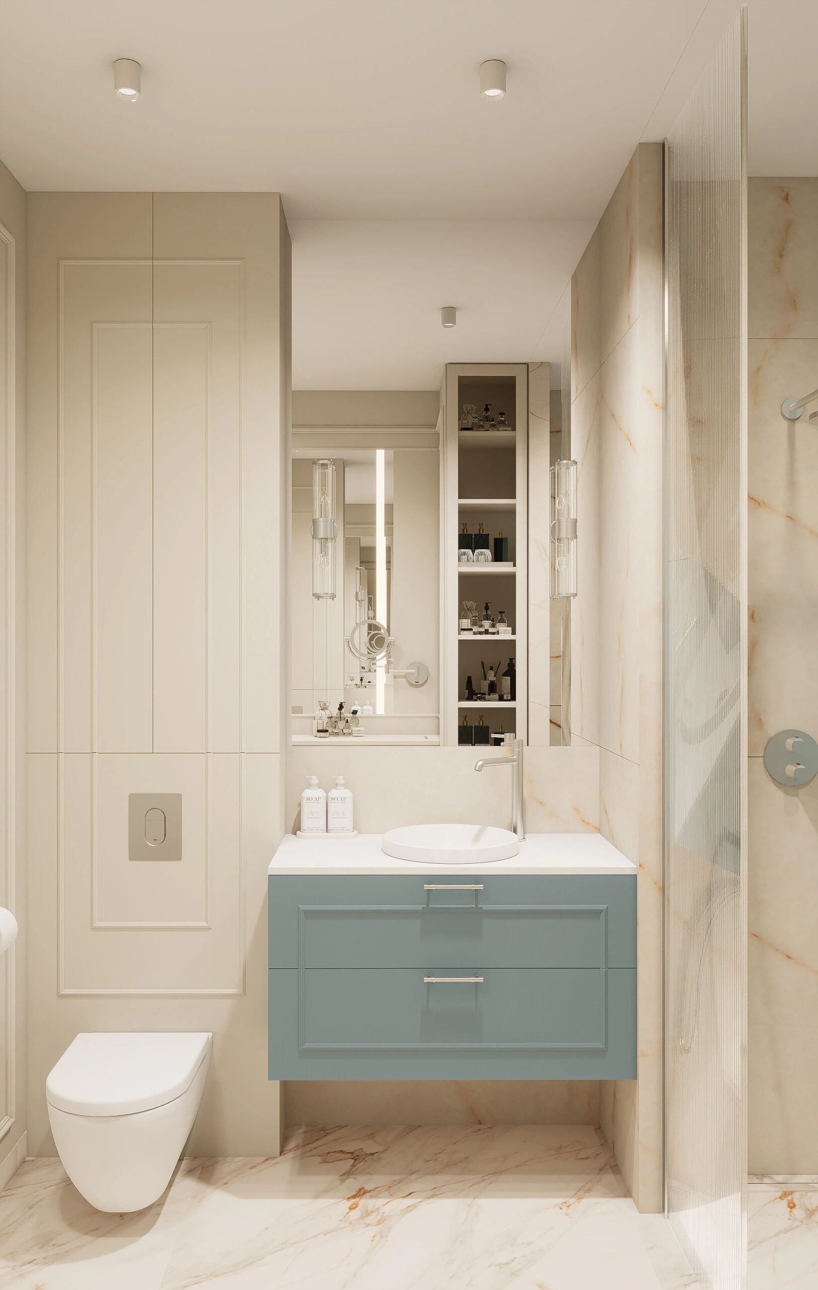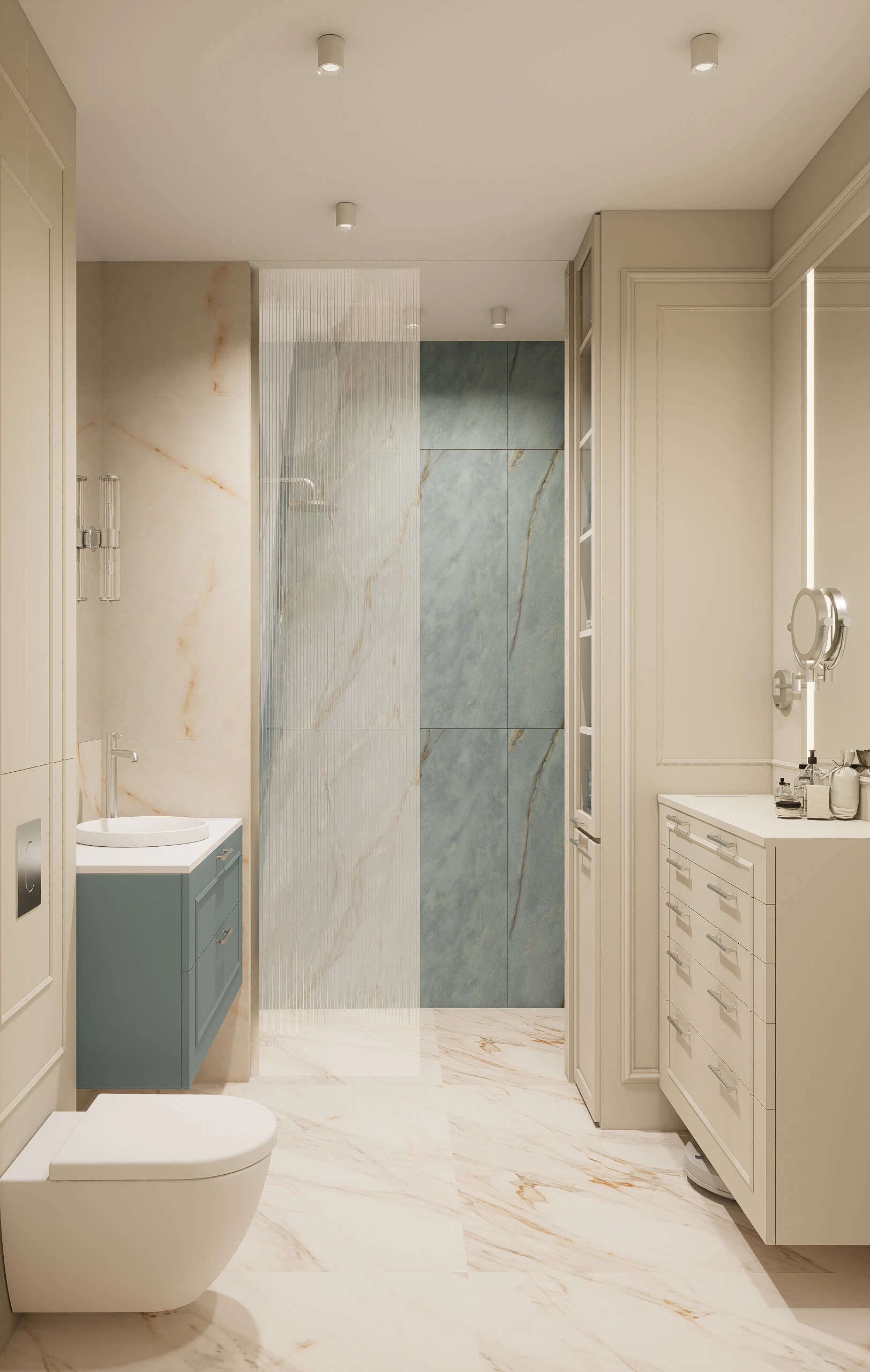 Bazą aranżacji są jasne, ciepłe odcienie bieli i beżu, klasyczne frezowane zabudowy oraz naturalne materiały, które nadają wnętrzu ponadczasowy charakter. Na tym spokojnym tle pojawia się niecodzienna, starannie dobrana kolorystyka – chłodne błękity w meblach tapicerowanych oraz głębokie akcenty czerwieni, które wprowadzają energię i wyrazistość. Całość uzupełniają kamienne powierzchnie o delikatnym rysunku oraz przemyślane oświetlenie, podkreślające faktury i proporcje wnętrza.