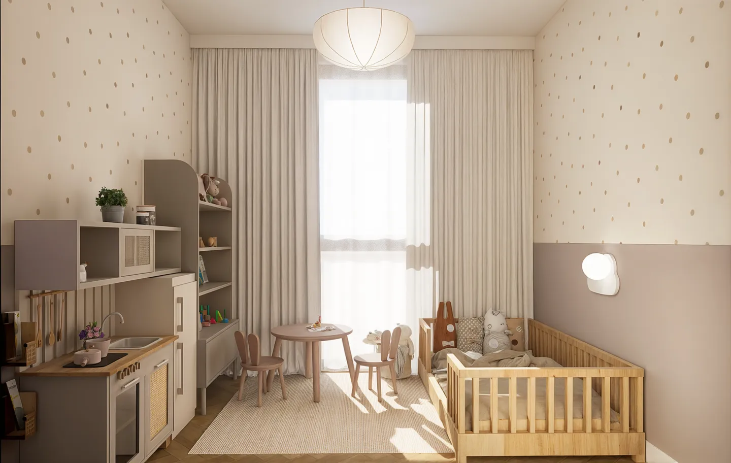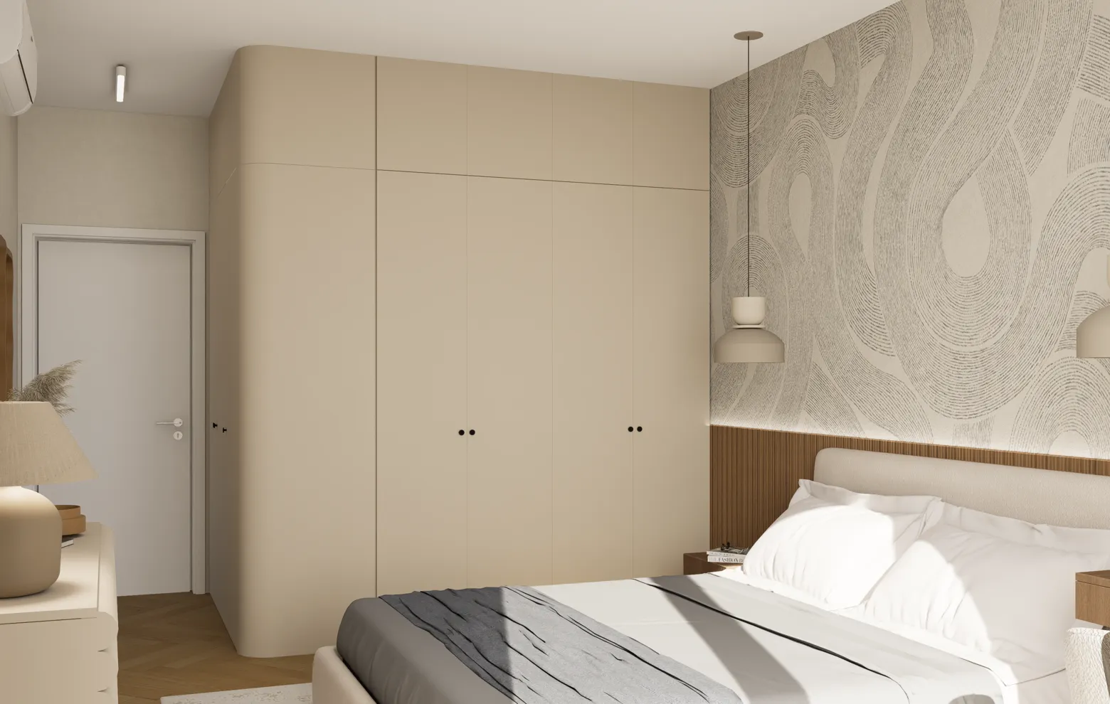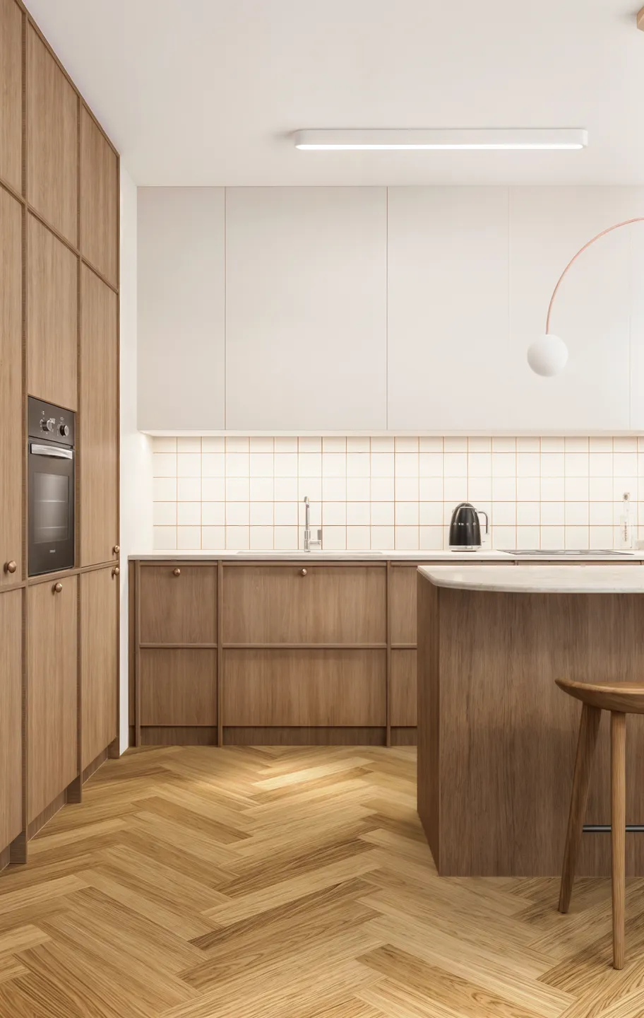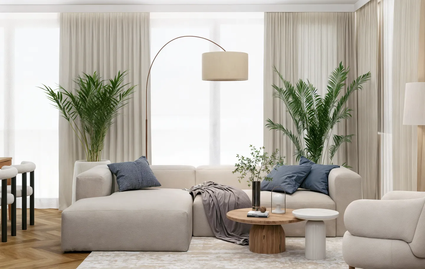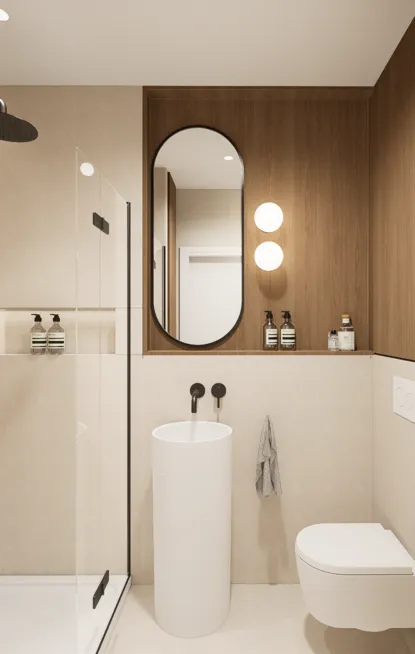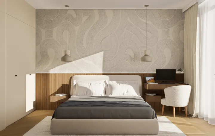 Projektowanie wnętrz w Warszawie rzadko osiąga taką harmonię, gdzie jasna paleta barw w odcieniach piaskowego beżu i złamanej bieli optycznie powiększa przestrzeń, tworząc idealne warunki do odpoczynku. Kluczową rolę odgrywa tu naturalne drewno o ciepłym wybarwieniu, zestawione z obłymi kształtami mebli oraz miękkimi teksturami tkanin typu bouclé, co nadaje aranżacji rzeźbiarski, a zarazem domowy charakter. Funkcjonalność projektu objawia się w przemyślanych zabudowach o zaokrąglonych narożnikach oraz ergonomicznym gabinecie, który płynnie wpisuje się w estetykę całego apartamentu. Każdy detal, od minimalistycznej łazienki z monolityczną umywalką po pełen słońca pokój dziecięcy, został zaplanowany z myślą o najwyższym komforcie użytkowników.