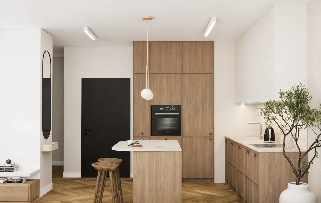 To nowoczesne mieszkanie na warszawskiej Pradze-Południe to kwintesencja stylu japandi, w którym japońska dyscyplina formy spotyka się ze skandynawską przytulnością.