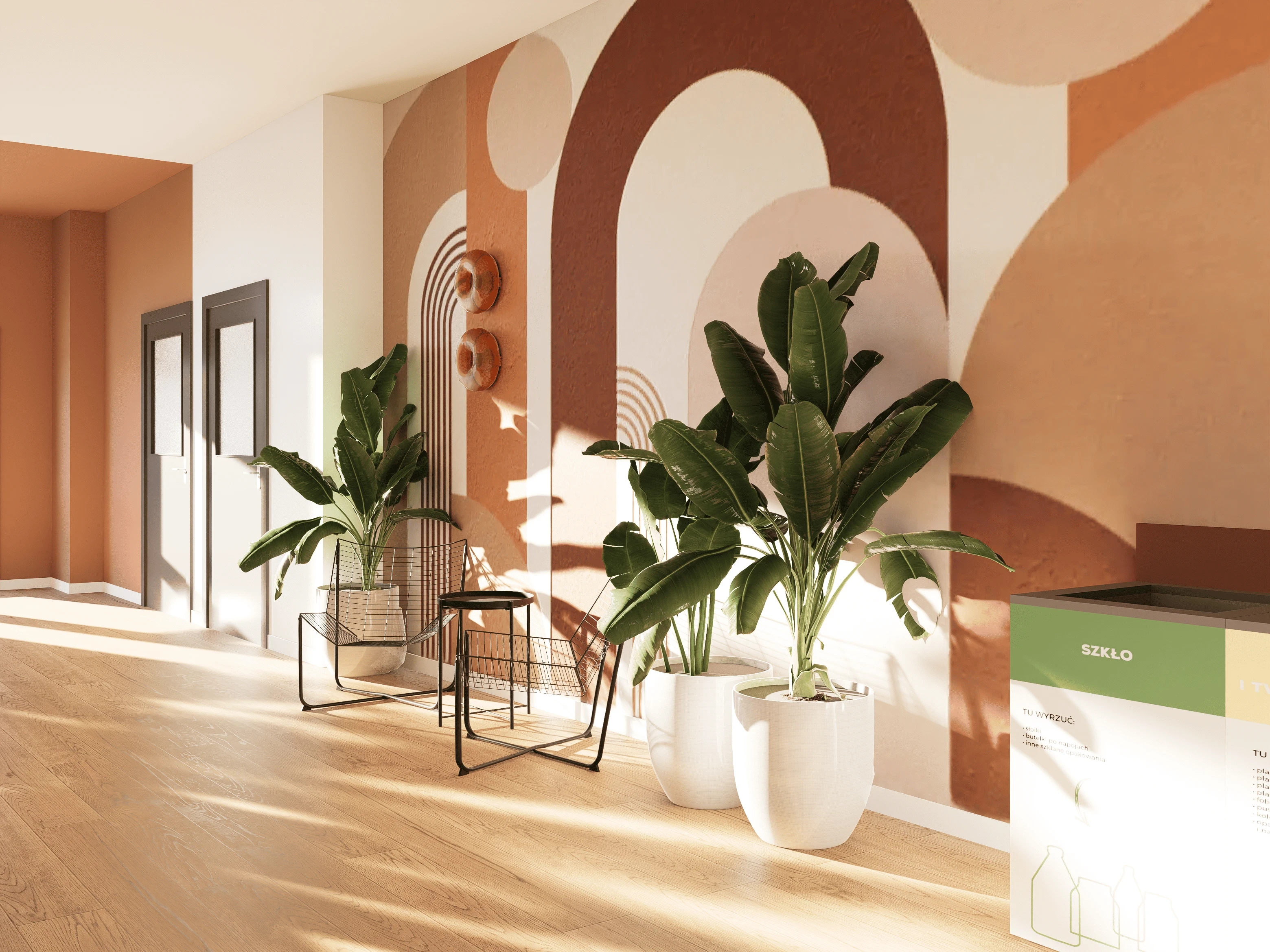 Sercem projektu jest spektakularny mural z geometrycznymi, obłymi formami w ciepłych odcieniach terakoty, brązu i beżu. Ten artystyczny element nadaje wnętrzu unikalny charakter i stanowi dynamiczne tło dla całej aranżacji.