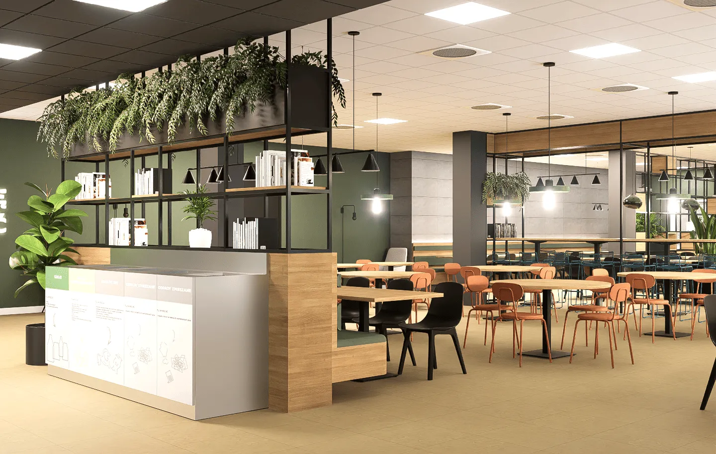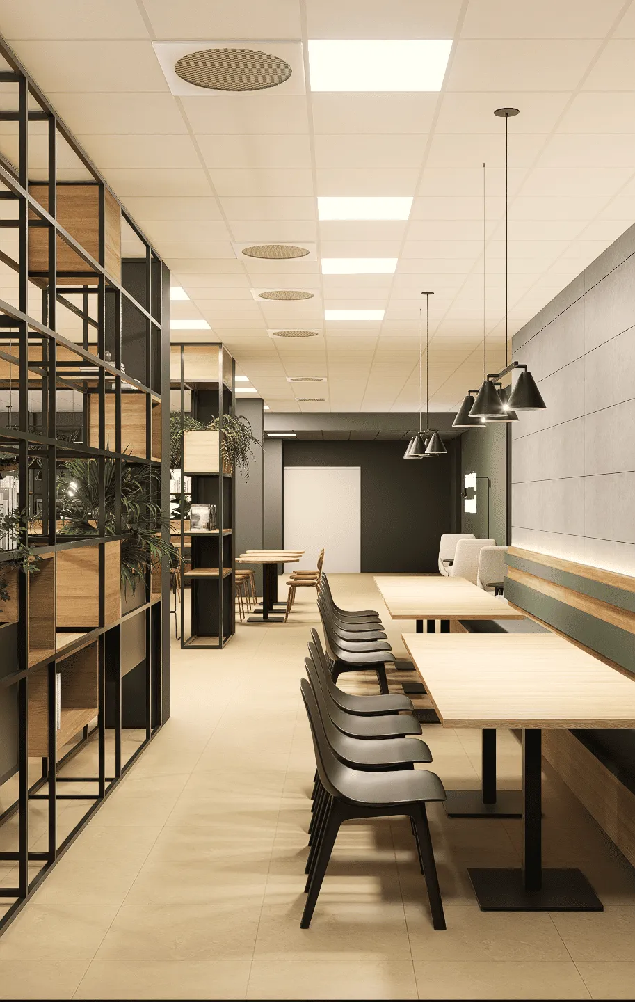 Przestrzeń została podzielona na różnorodne strefy za pomocą ażurowych, metalowych regałów, które pełnią funkcję nie tylko dekoracyjną, ale i praktyczną. Wypełnione książkami i dużą ilością żywych, zwisających roślin, tworzą one półprywatne enklawy, nie zaburzając przy tym poczucia otwartości. Wnętrze oferuje różne typy siedzisk: od standardowych stołów, przez wysokie stoły barowe, aż po komfortowe loże i fotele, co pozwala na elastyczne korzystanie z przestrzeni.