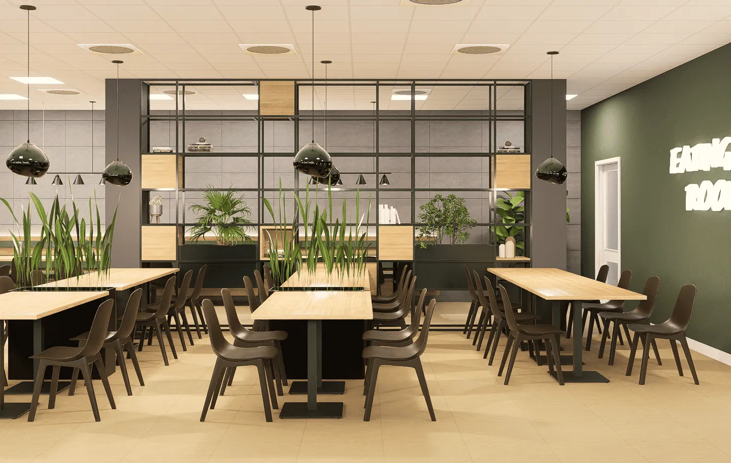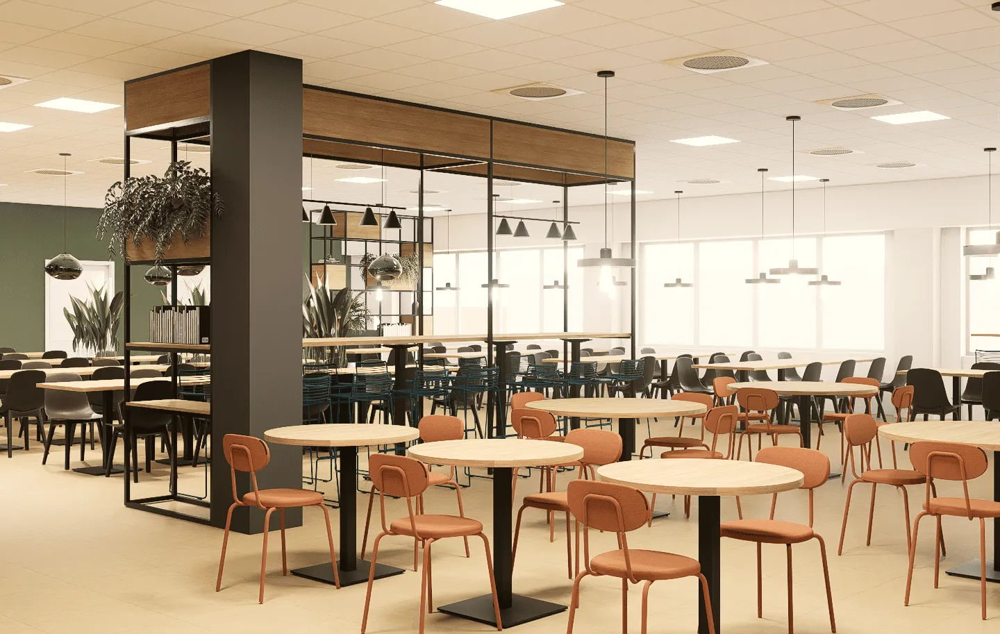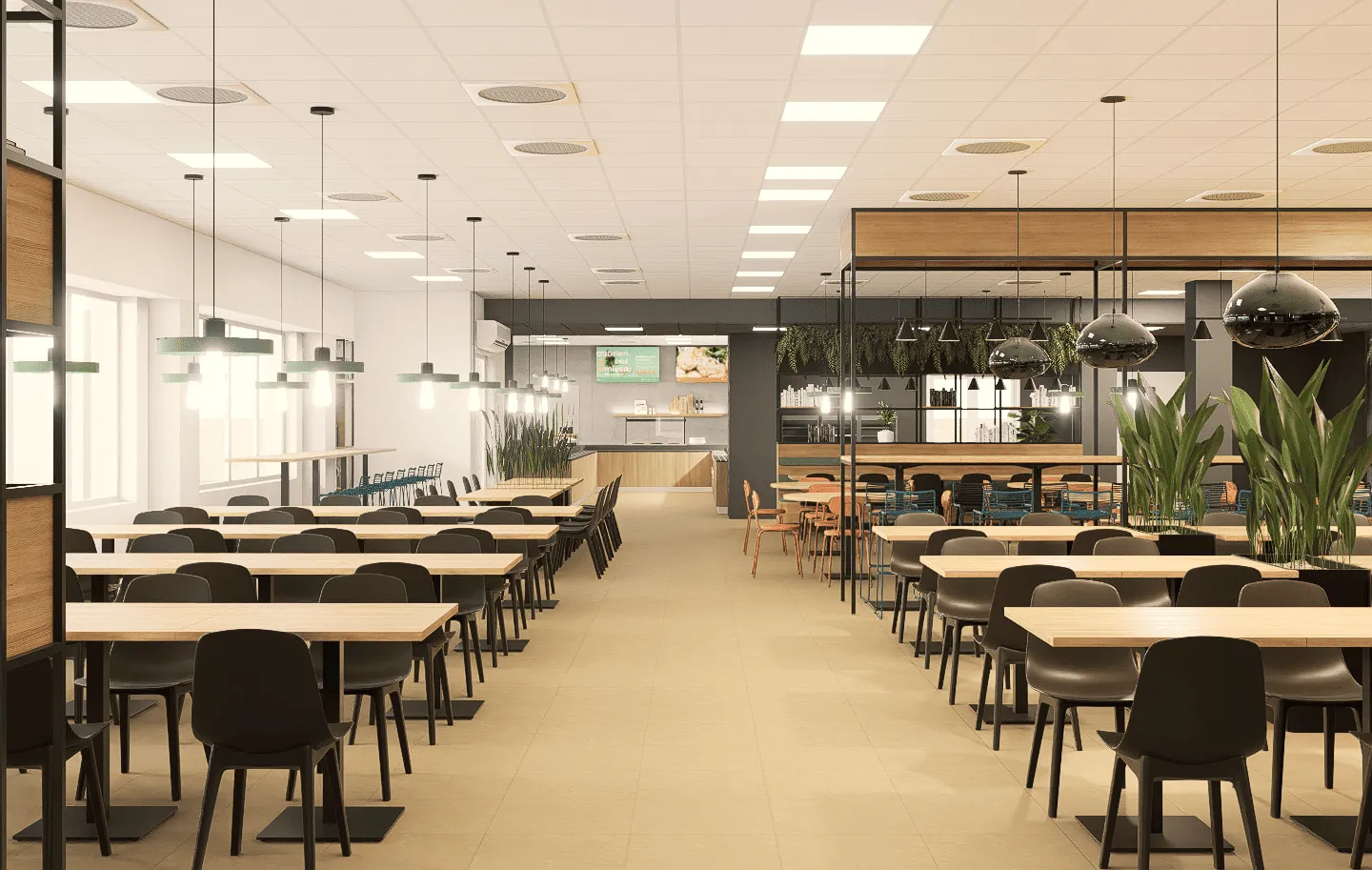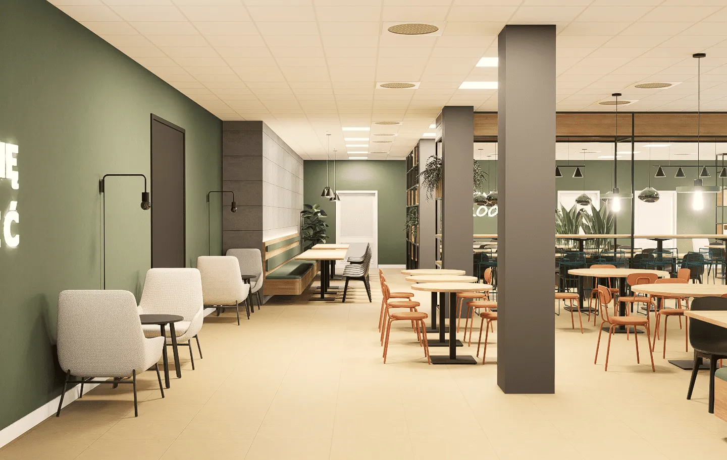 Prezentujemy projekt wnętrz przestronnej kantyny pracowniczej, zlokalizowanej w nowoczesnym centrum logistycznym pod Wrocławiem. Głównym celem było stworzenie wielofunkcyjnej przestrzeni, która będzie nie tylko miejscem spożywania posiłków, ale także strefą relaksu, spotkań i regeneracji sił w ciągu dnia pracy.