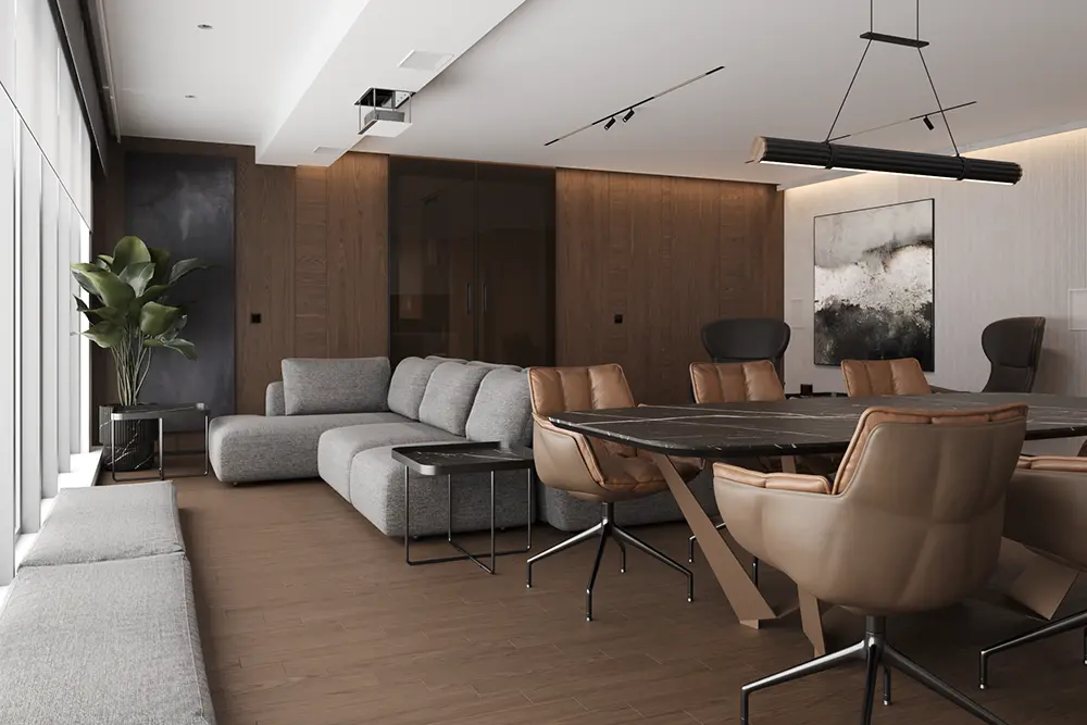 W strefie dziennej apartamentu szara kanapa zaprasza do relaksu, oferując widok na panoramę miasta. Przestronność wnętrza apartamentu podkreśla duży stół, idealny do pracy, a swoboda poruszania się między pomieszczeniami i wokół mebli zapewnia komfort użytkowania.