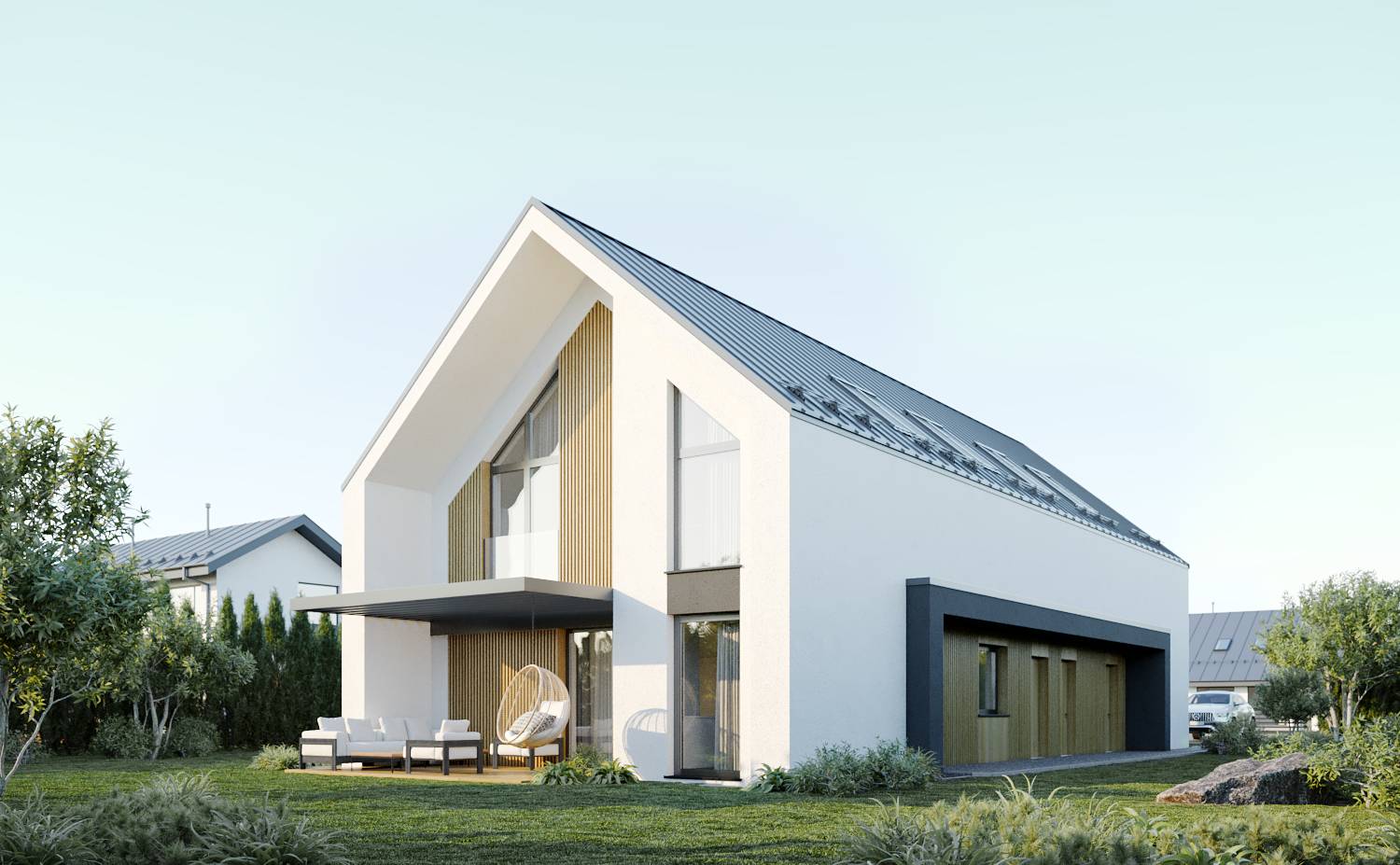 Styl budynku to połączenie nowoczesności i skandynawskiej prostoty. Biel i grafit dominujące w elewacji nadają mu współczesny charakter, a naturalne drewno wprowadza ciepły, skandynawski akcent, podkreślając związek z naturą.