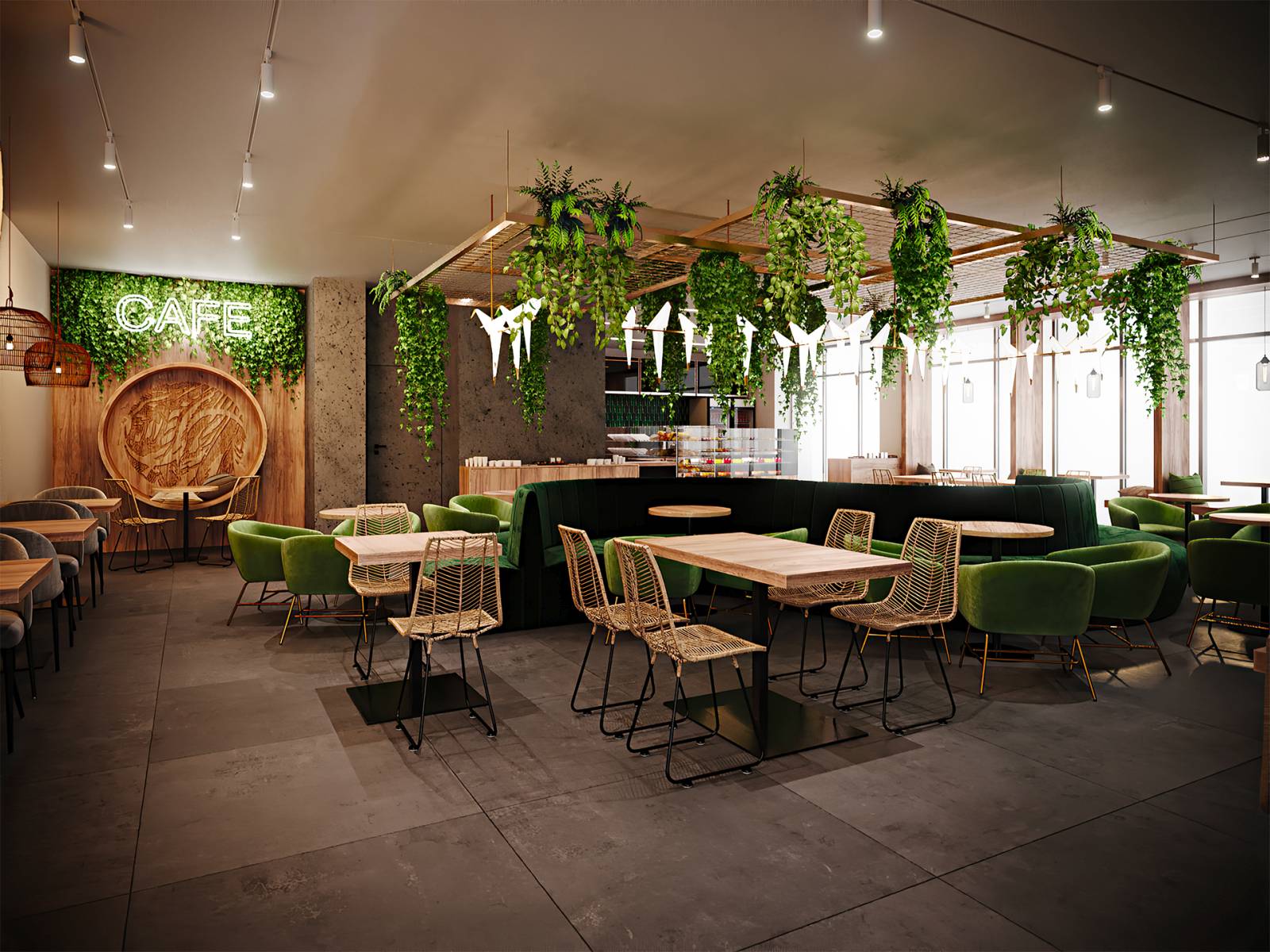 Projekt kawiarni został również wzbogacony o kantynę pracowniczą, będącą azylem dla personelu, gdzie mogą oni odpocząć od swoich obowiązków oraz sklep, w którym klienci mogą dokonać zakupów po chwili relaksu.