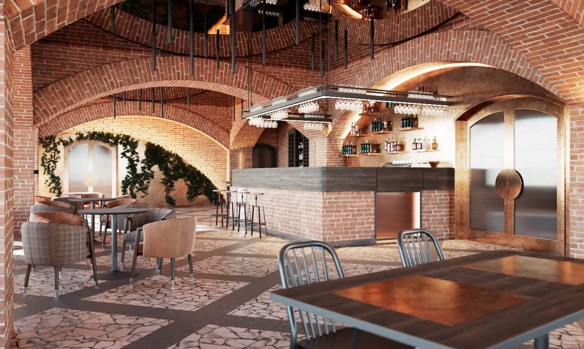 Aby zrównoważyć ten industrialny charakter, wprowadzono roślinność oraz ciepłe barwy światła. Elegancji dodają także sklepienia łukowe i dbałość o detale.