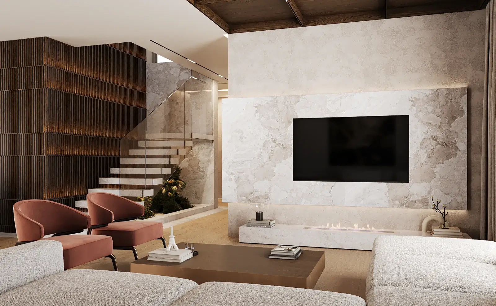 Wnętrze domu 260 m2 urzeka połączeniem naturalnego ciepła drewna i chłodnej elegancji marmuru. Ciemne, drewniane elementy, pojawiające się na różnych poziomach, nadają przestrzeni surowego piękna i przytulności.