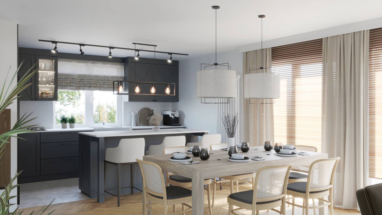 Ciemne meble kuchenne kontrastują z jasną jadalnią, tworząc ciekawe przejście między strefami. Drewniana podłoga i schody wprowadzają naturalne ciepło, a ciemna szafka w holu dodaje wnętrzu głębi.
