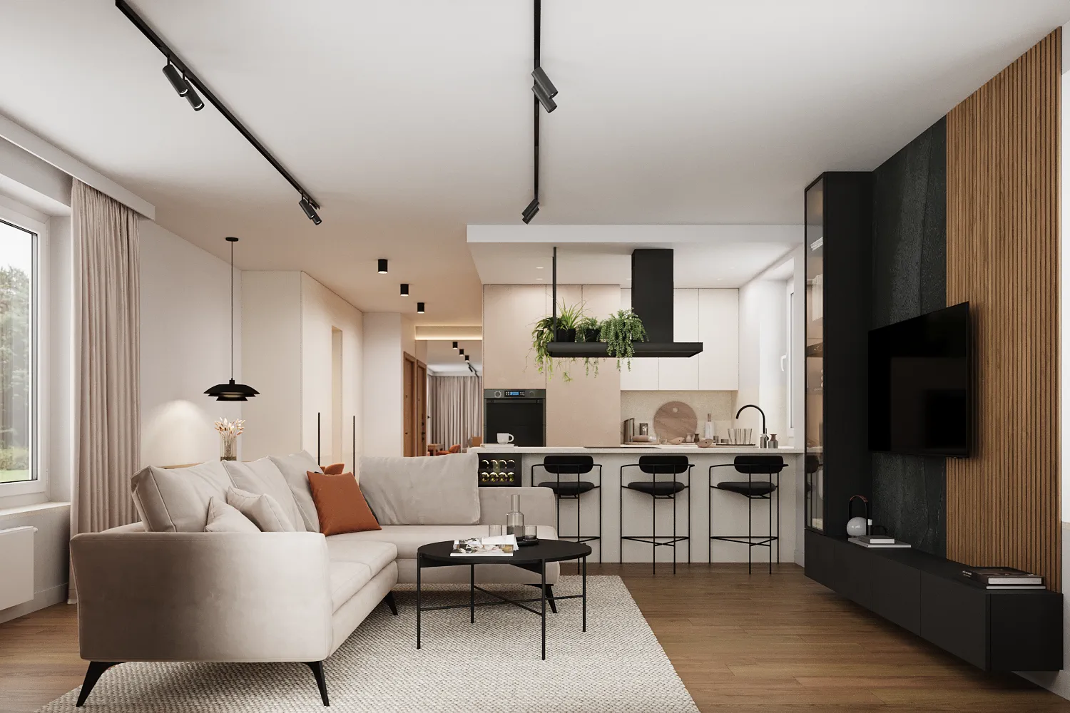 Drewniana podłoga wprowadza do wnętrza ciepło, a jasne, naturalne materiały wykończeniowe, takie jak zasłony, dodają mu przytulności. Natomiast czarne elementy wykończenia wprowadzają nowoczesny akcent, nadając przestrzeni unikalny i oryginalny charakter.